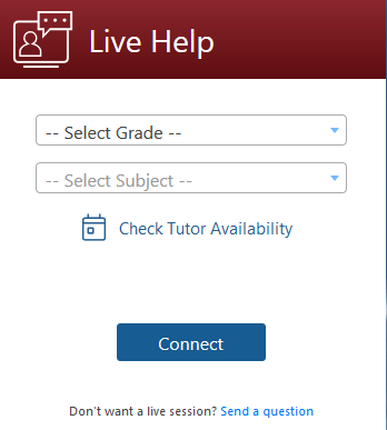 Access Live Tutoring: To get online tutoring right away, simply select a topic and subject from the drop-down menu, click “Connect” and begin learning from a live tutor through the Brainfuse Whiteboard.