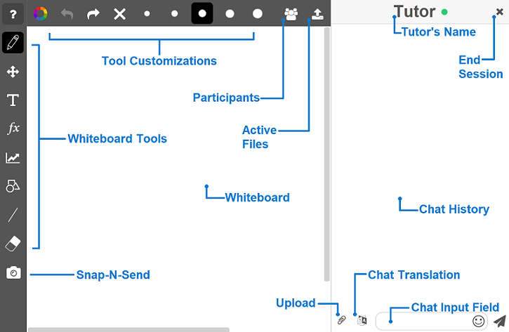 UPLOAD FILES TO SHARE WITH TUTOR: Click on the Upload button (bottom left of the Chat Box) to upload images, papers, or other assignments to work on them in real time with your tutor.