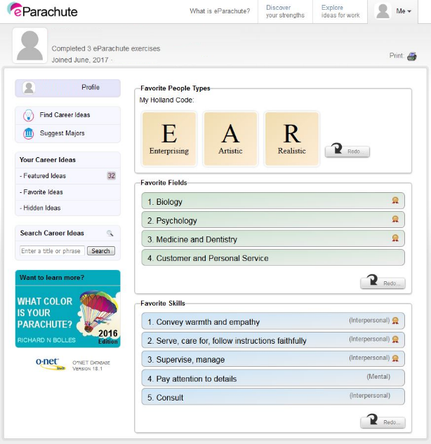 Review suggested career or academic paths based on your unique profile that includes your interests, skills, and more.