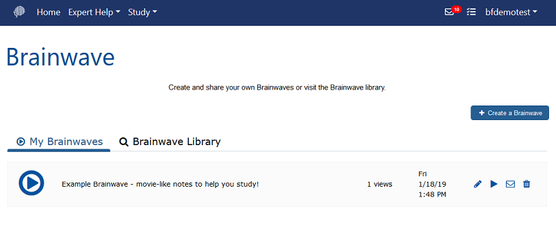 Brainwave: Create and share dynamic content Create movie-like notes (Brainwaves) by recording your activity on the Brainfuse Whiteboard. Brainwaves are ideal for studying or sharing concepts that involve multi-step processes