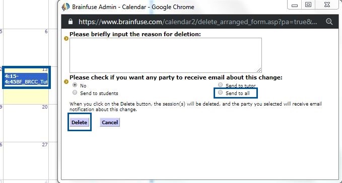 2. Select the approved session you want to delete. Choose “Cancel” and the delete window will appear. Enter a reason for deletion and choose “Send to all” to ensure you and the student receive an email notification. When finished, choose “Delete” to remove the session from your scheduled tutoring shifts.