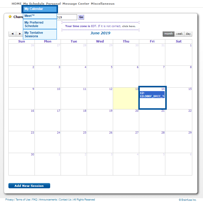 1. Select “My Calendar” from the “My Schedule” menu option to view all of your previously accepted tutoring sessions.