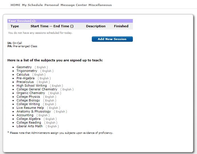 SESSION NOTE: View information provided by the student when the tutoring session was scheduled, including the start/end time, the subject, and any note provided by the student.