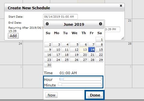 4. When you choose your date, select the start time and the end time for your tutoring availability and select “Done.” You may also make this recurring (daily, weekly, or monthly). Select “Add” to create save the available tutoring schedule.