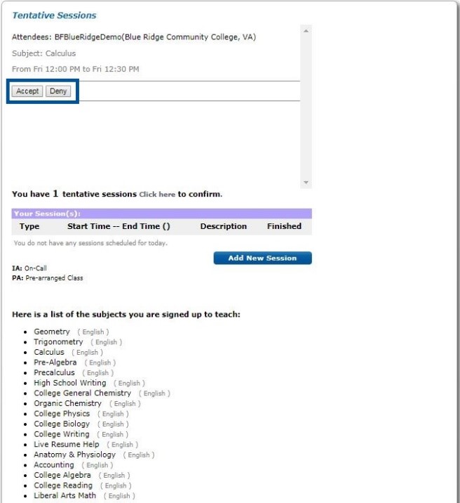 1. When a student attempts to schedule a session with you, you’ll see a “Tentative Session” listed on your tutor homepage. Review the student’s chosen subject, date, and time and then either “Accept” or “Deny” the session.