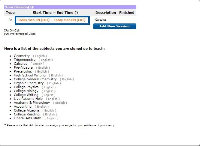 2. To begin the scheduled tutoring session, click on the session time noted on the homepage. This will prompt a pop-up window with the Brainfuse Tutor Whiteboard to appear. All online tutoring sessions will use this whiteboard.