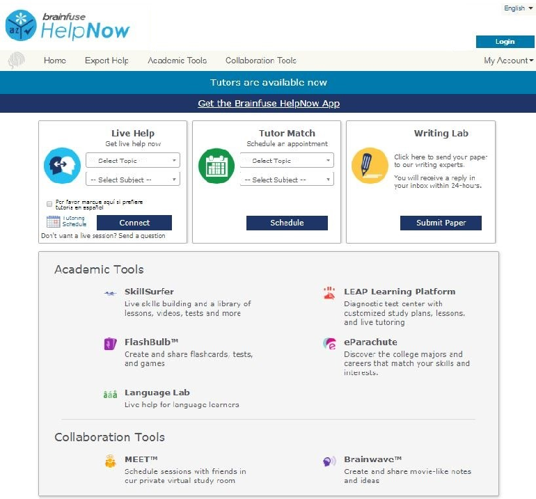 Brainfuse Tutor Match provides students the ability to schedule live tutoring sessions with tutors for assistance in their selected subject. Through Tutor Match, students will connect with tutors using the same Brainfuse Whiteboard used during live tutoring sessions.