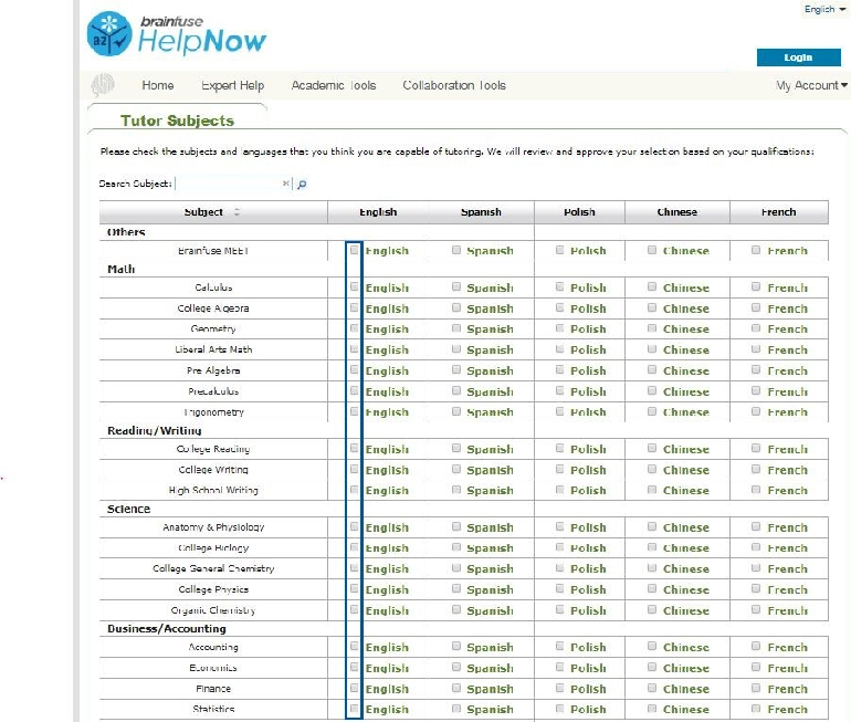 3. After the account details have been entered, you’ll be able to select the subjects you are able to tutor. When you identify the subject you want to tutor, select the checkbox next to “English” in the subject’s row. You may select as many subjects as you are able to tutor. If you are able to tutor a subject using a different language (e.g. “Spanish”), select the checkbox next to “Spanish” in the subject’s row.