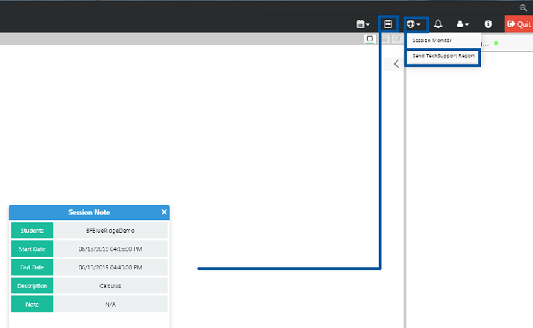 SEND TECHSUPPORT REPORT: Automatically send technical details about the session to the Brainfuse Tech Team for any technical issues encountered. Students and tutors may also email [email protected] or contact the Tech Support line for additional assistance.