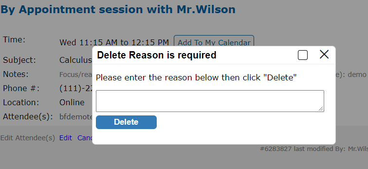 3. If prompted, enter a reason for deletion. When finished, choose “Delete” to remove the session from your scheduled tutoring shifts.