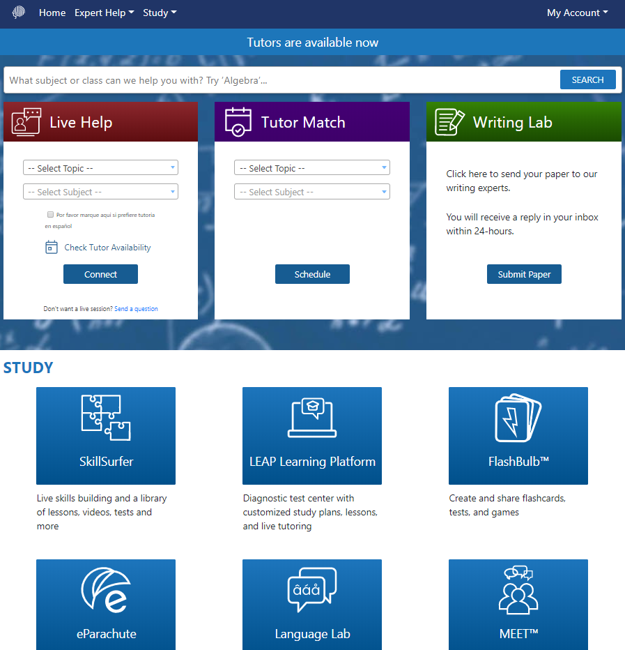 Brainfuse Tutor Match provides students the ability to schedule live tutoring sessions with tutors for assistance in their selected subject. Through Tutor Match, students will connect with tutors using the same Brainfuse Whiteboard used during live tutoring sessions.