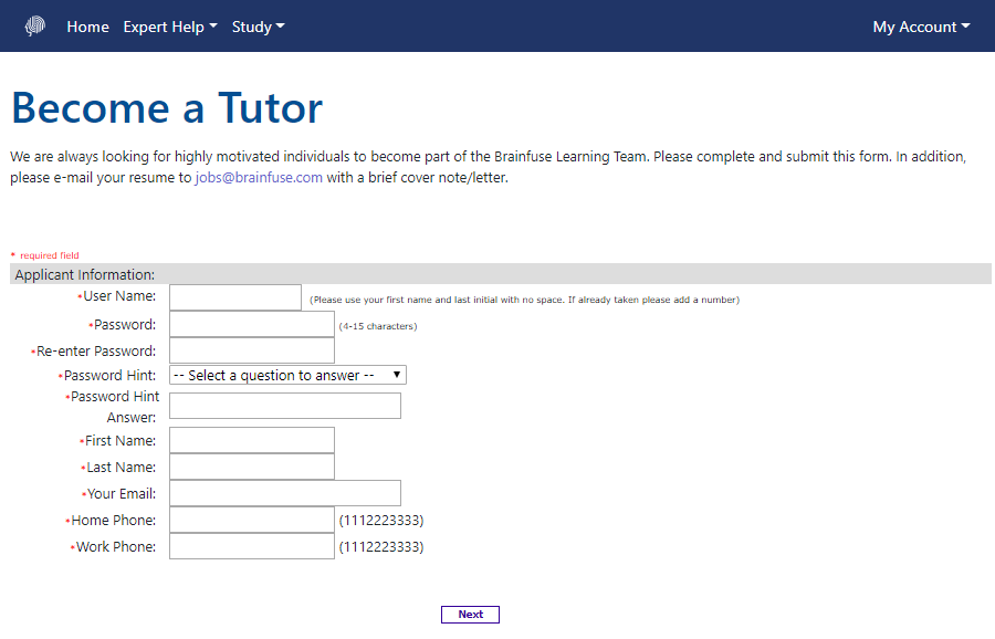 2. Once you select “Register as a Tutor,” you will be able to create your tutor account by entering the requested information. When the required information is entered, select “Next.”