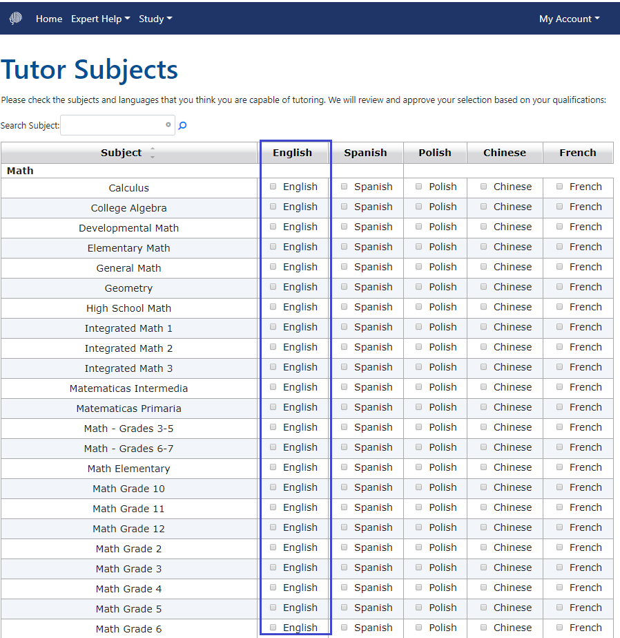 3. After the account details have been entered, you will be able to select the subjects you are able to tutor. When you identify the subject you want to tutor, select the checkbox next to “English” in the subject’s row. You may select as many subjects as you are able to tutor. If you are able to tutor a subject using a different language (e.g. “Spanish”), select the checkbox next to “Spanish” in the subject’s row.