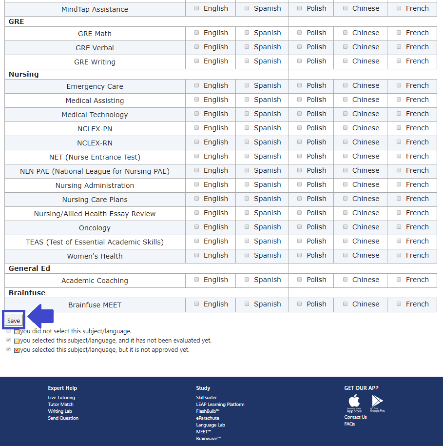 4. When you have selected all the subjects you are able to tutor, select “Save” at the bottom of the page.