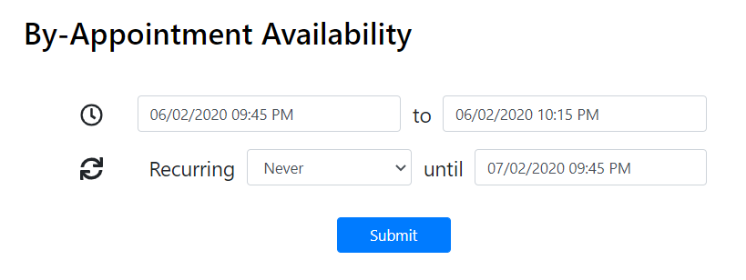 4. Once you have entered your date and time, you may also choose a recurring option. Once the details are entered and complete, select “Submit” to save the available tutoring schedule.