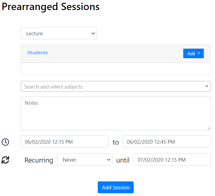 e. Recurring: tutors may choose from the recur options to schedule future sessions with the same students at the same time.