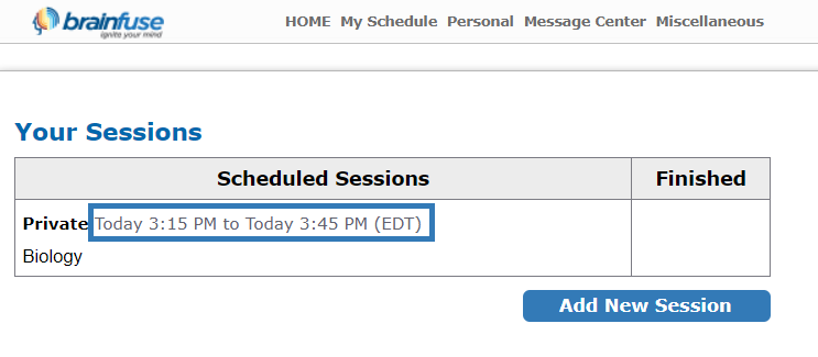 7. To begin the scheduled tutoring session, click on the session time noted on the homepage. This will prompt a pop-up window with the Brainfuse Tutor Whiteboard to appear. All online tutoring sessions will use this whiteboard.