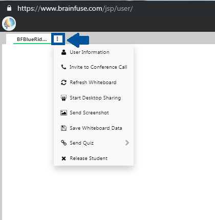 STUDENT TAB OPTIONS: At the top of the whiteboard, the student tab has a menu (i.e. three dots) that contains the following options for the tutor to use during a scheduled tutoring session: