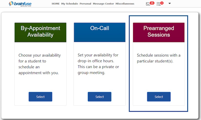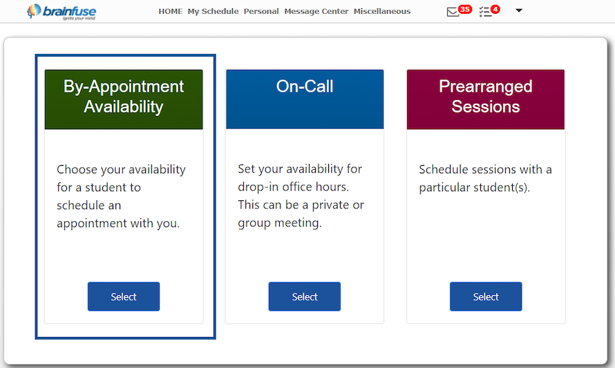 2. From the Brainfuse homepage, select “Add New Session.” You will then see the available session options. To enter your availability for tutoring session, use the “By-Appointment Availability” option.