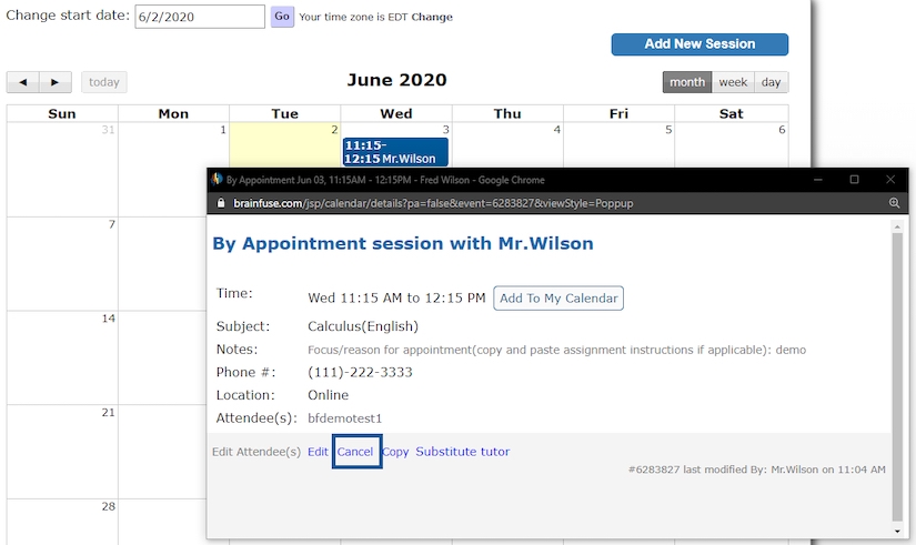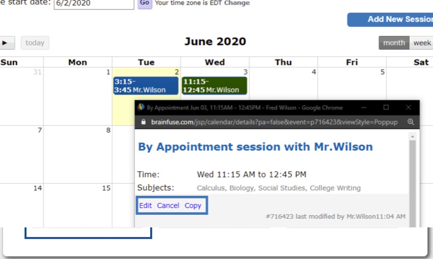 5. Once added, the prearranged session will be automatically approved and added to the calendar for both tutor and student(s). Students and tutors will access these sessions as they do any other scheduled sessions.