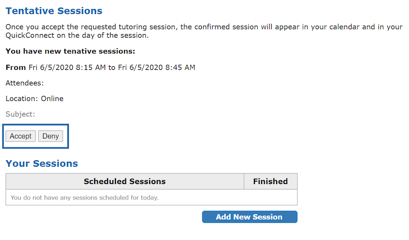 1. When a student attempts to schedule a session with you, you will see a “Tentative Session” listed on your tutor homepage. Review the student’s chosen subject, date, and time and then either “Accept” or “Deny” the session.