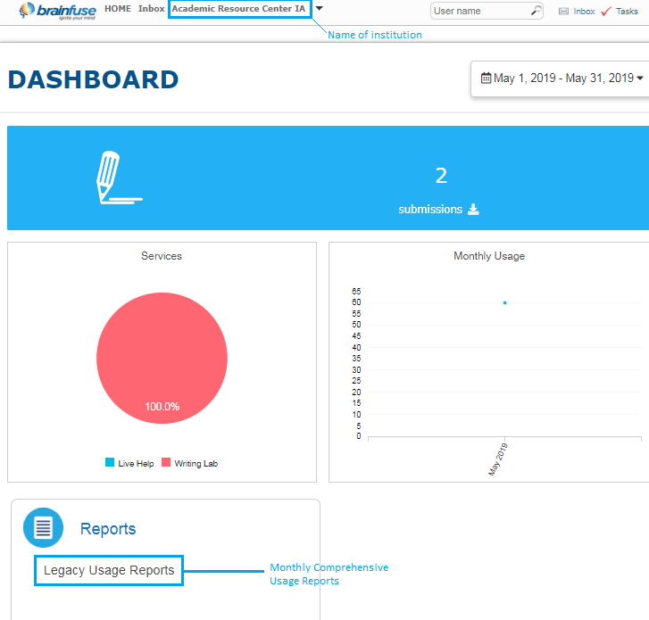 Total Usage (Live Session, Resume/Writing Submission, Test Center Visits, and Database Usage) – this row is the count of ALL usage on Brainfuse, irrespective of type