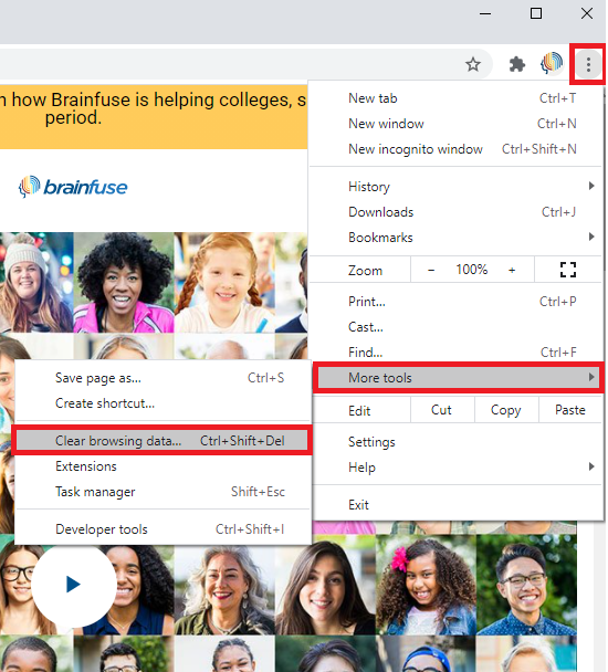 Regardless of the browser used, at times you may encounter an error message that can be easily resolved by simply clearing your preferred browser’s cache and cookies. To help with his process, we’ve created this step-by-step guide for the most popular browsers used to access Brainfuse. To clear your cache and cookies, select the browser you use below and follow the steps shown.