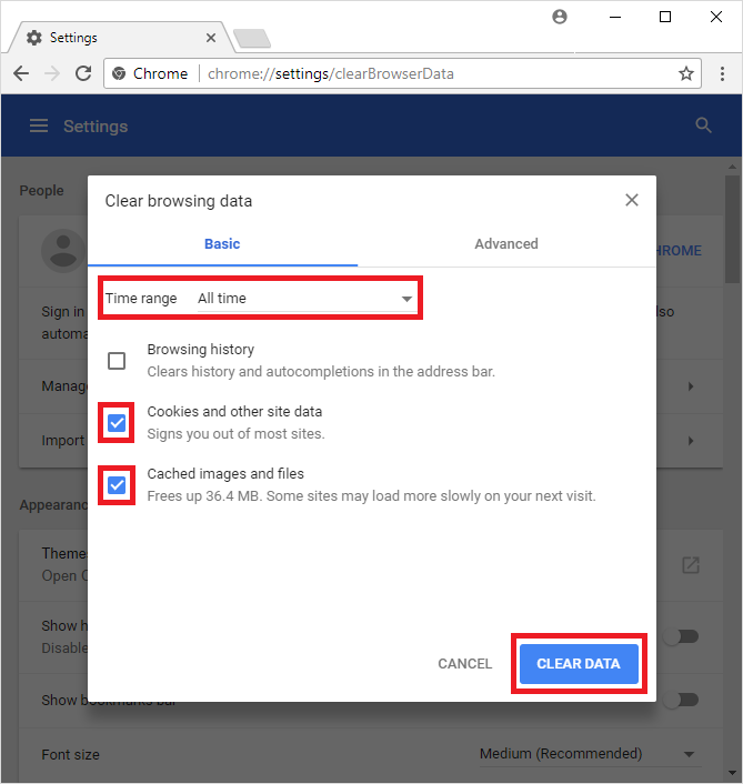 Select All time in the Time range drop down box and click on the CLEAR DATA button.