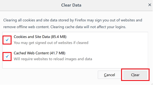 - In the pop-up menu, make sure both boxes are checked for Cookies and Site Data and Cached Web Content, then click Clear.