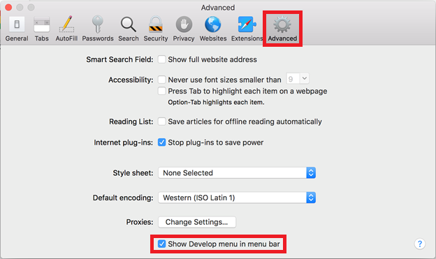 In the Preferences window, click the Advanced tab and make sure the checkbox next to Show Develop menu in menu bar is selected.