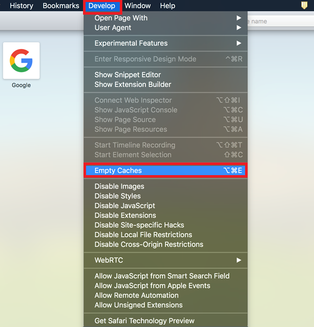 Select Develop in the menu bar on the top of the screen and click Empty Caches.