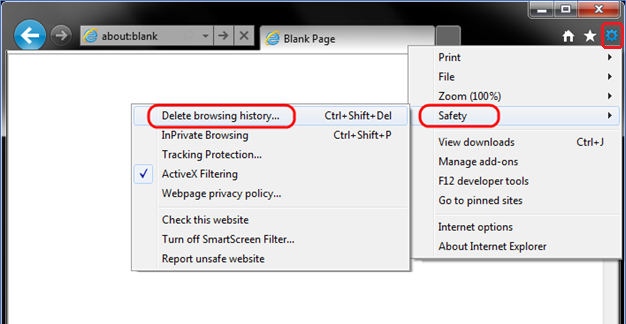 - Select Tools (via the Gear Icon) > Safety > Delete browsing history....