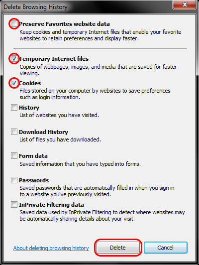 - Make sure to uncheck Preserve Favorites website data and check both Temporary Internet Files and Cookies then click Delete.