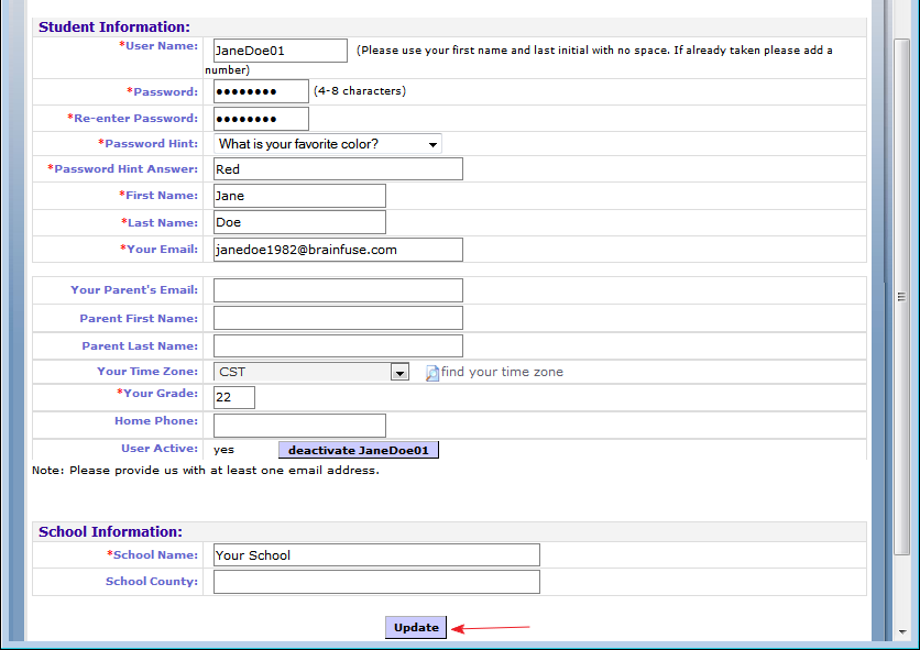 3. Update the profile as needed. Before clicking the update button, make sure that all of the required fields (marked with *) have a value. Once completed, click the "Update" button at the bottom of the page.