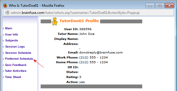 4. A popup will show the selected tutor's profile. From the profile menu, select the "Preferred Schedule" link on the left.