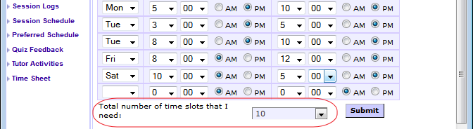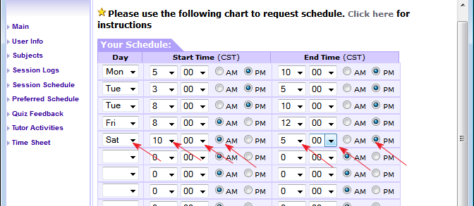 5. Add/Edit the fields for the tutor's schedule. For help, select the "Click Here" link on top of the schedule for instructions on how to fill out the schedule fields.