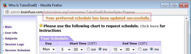 8. If there are no errors you will see "Your preferred schedule has been updated successfully" at the top of the window. Any errors will prompt a popup error indicating the error.
