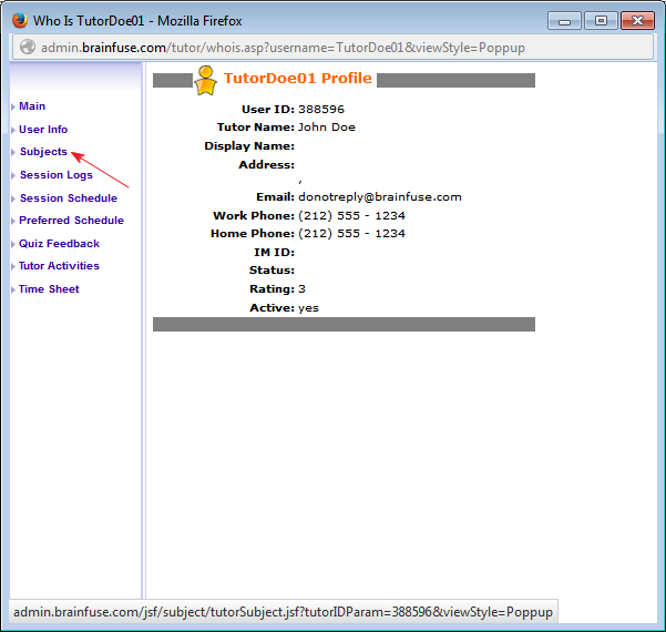 4. A popup will show the selected tutor's profile. From the profile menu, select the "Subjects" link on the left.