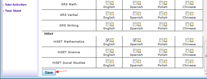 6. Once you made have added or removed the desired subjects and/or languages, click on the "Save" button at the bottom of the window.